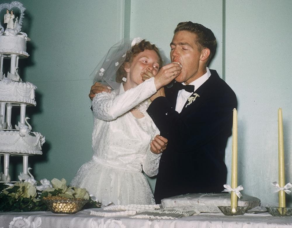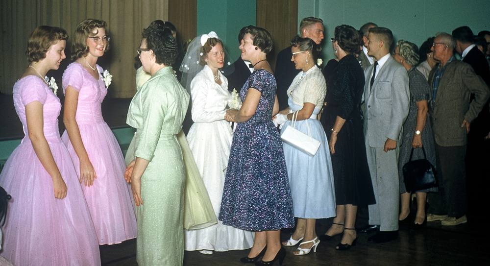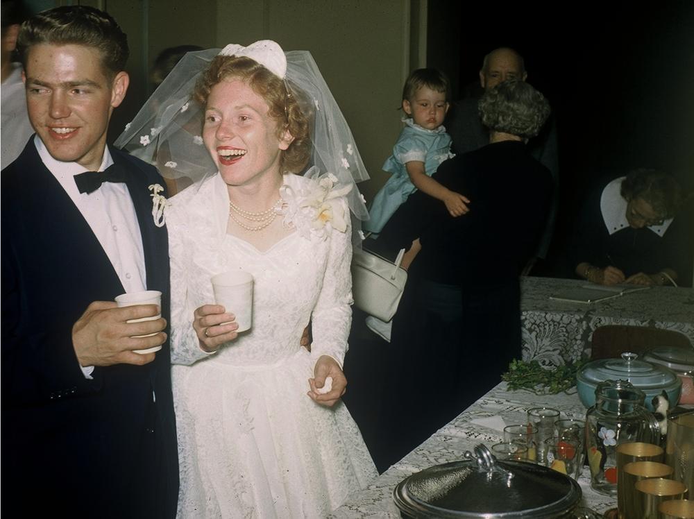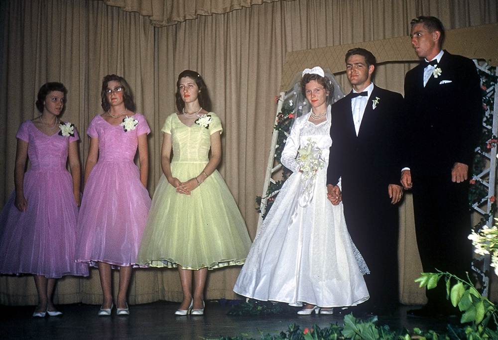 b) Reception at LDS Pasadena Ward. From Left: Doris Cottam (who later married Buddy Jensen - far right - a CalTech classmate of Ed), Joan Wilkins - Carole's cousin, June Patton - Carole's best friend. (Bridesmaids dresses cost $13 each at Penney's in El Monte.)