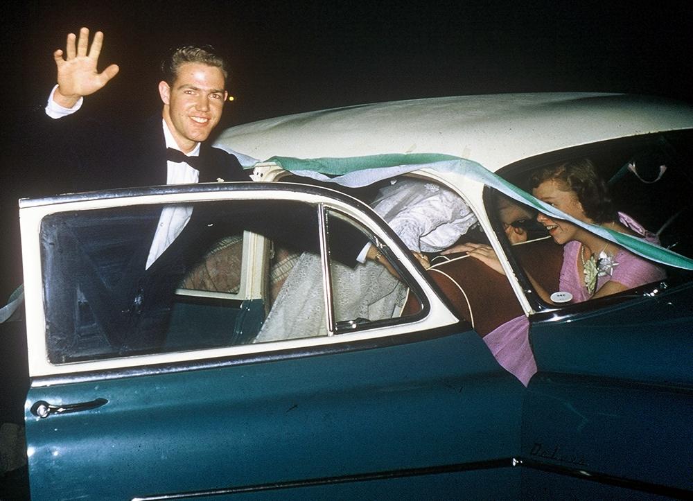 f) Leaving reception, getting into Buddy's Chevrolet. Doris in front seat.