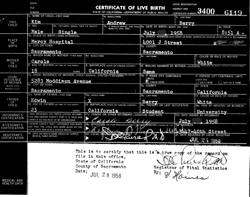 Kim was born July 1958 at Mercy Hospital at 4001 J Street in Sacramento