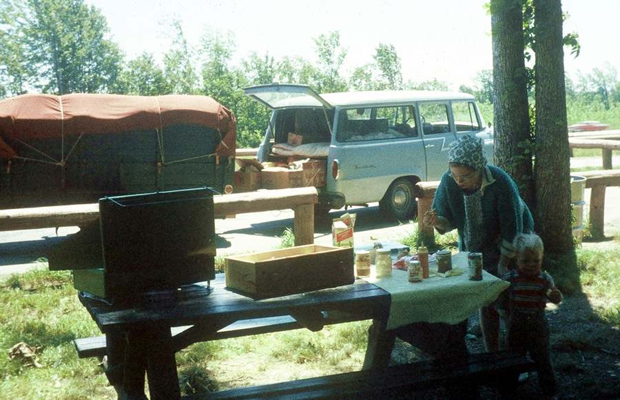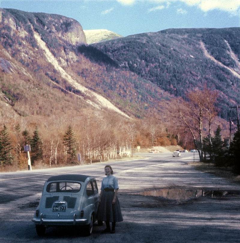 Kim Berry - 1958 - 1960 in New HampshireEd graduated from Caltech in June 1957. The following school year he was a part time physics instructor and part-time graduate student as Sac State (CSU Sacramento). About April 1958 he saw a notice on the wall of the physics department about teaching fellowships at Dartmouth College, so he applied. There were only six positions awarded and he was one of the six. So the summer of 1958, when I was only a few weeks old, he bought the old truck and drove to New Hampshire. His younger brother Jay did not have anything better to do, so what the hell! The truck allowed them to camp out the whole way, kind of like the original hippie truck. My mother and I came by airplane some weeks later. Ed started the teaching job and as a graduate student at Dartmouth in September 1958. The Teaching Fellowship paid his whole way to getting a masters degree plus he learned a lot just being a teaching fellow. When they arrived the bought a used Fiat. Here's Carole posing in October 1958 near "Old Man in the Mountain":