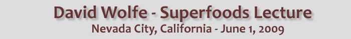 In 1998 working at HP I would gorge myself on massive "vegetarian burrito" stuffed with cheese and sour cream - not understanding the connection to why I'd get so sleepy around 3pm. In spite of the nice "food court" cafeteria, a friend was bringing salad, avocado, dates. When I asked, that was the moment I first heard of "raw food." And initially I thought it sounded crazy. For the past few years, the books and videos by David Wolfe have been among my key diet influences. He conducts lectures and workshops around the world. So when I learned he would be in Nevada City promoting his new book, I decided to attend. The lecture was in a "meditation room" at www.shuniaa.com. It was a nice environment with about 60 attendees sitting on pillows on the floor. Plates of a variety of chocolate provided by www.sacredchocolate.com - such as rooibos and ginger flavored - were passed around. He mentioned that he had driven over 6000 miles during his tours over the past six weeks. David stresses that he is giving "spiritual advice" because in the USA only licensed physicians and experts can give "medical advice" - advice that is controlled by the lobbyists for medical and pharmaceutical industries. He grew up the child of two physicians on a diet of "fruit-loops and pasteurized..... milk" - like the rest of us.