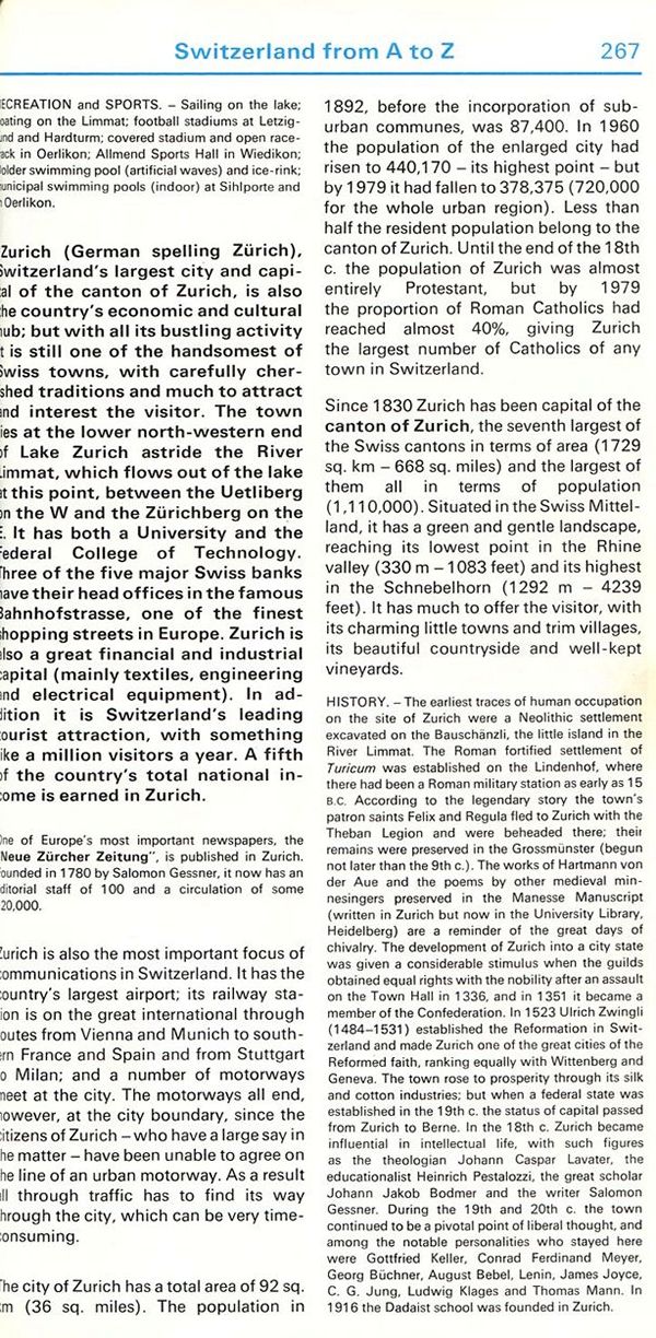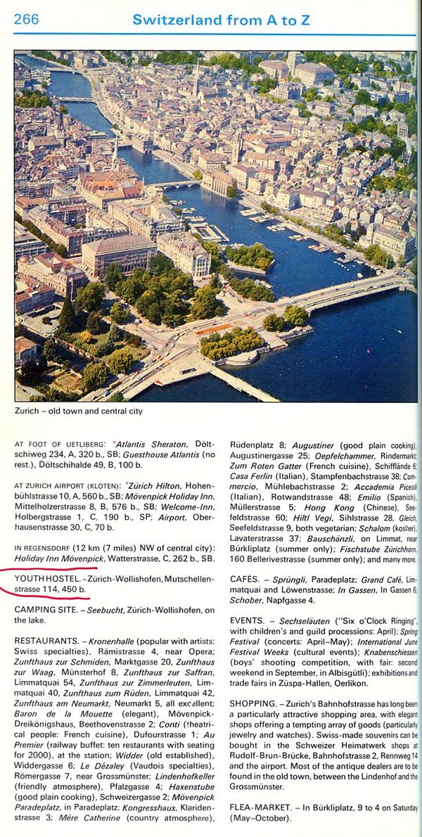 The hostel has not changed. That's is probably the same foosball machine that I played. Joan Jett "I love Rock and Roll" was playing on the stereo. Of course no Internet. Here are the Zurich pages from the Baedeker's guide book that I carried: