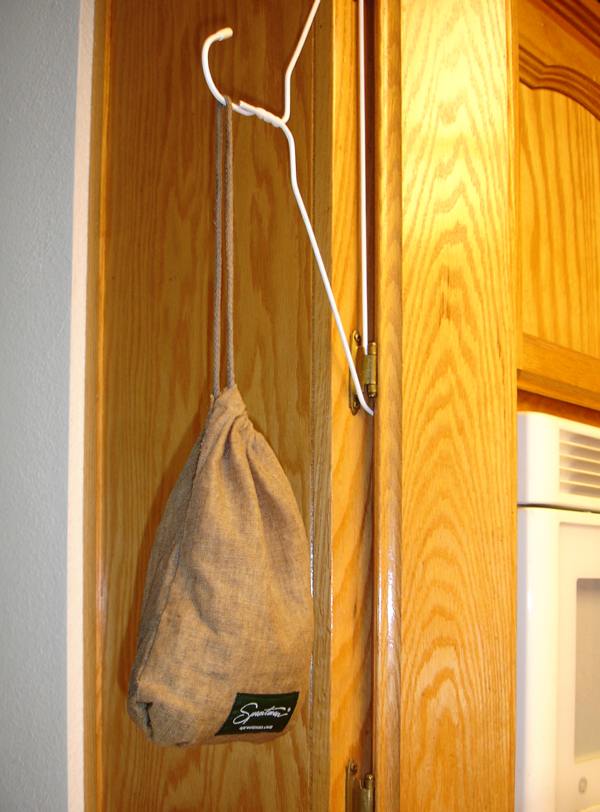 Step 2: twice a day soak the bag in a pan of filtered water, then re-hang.