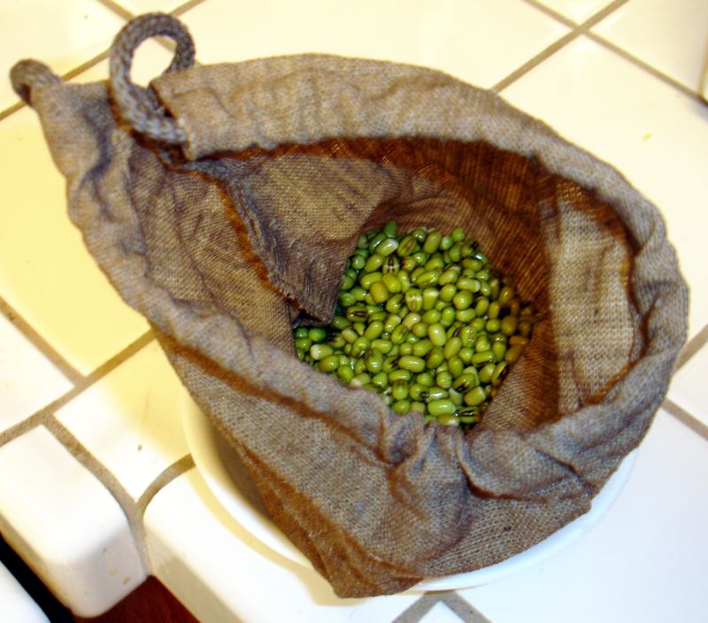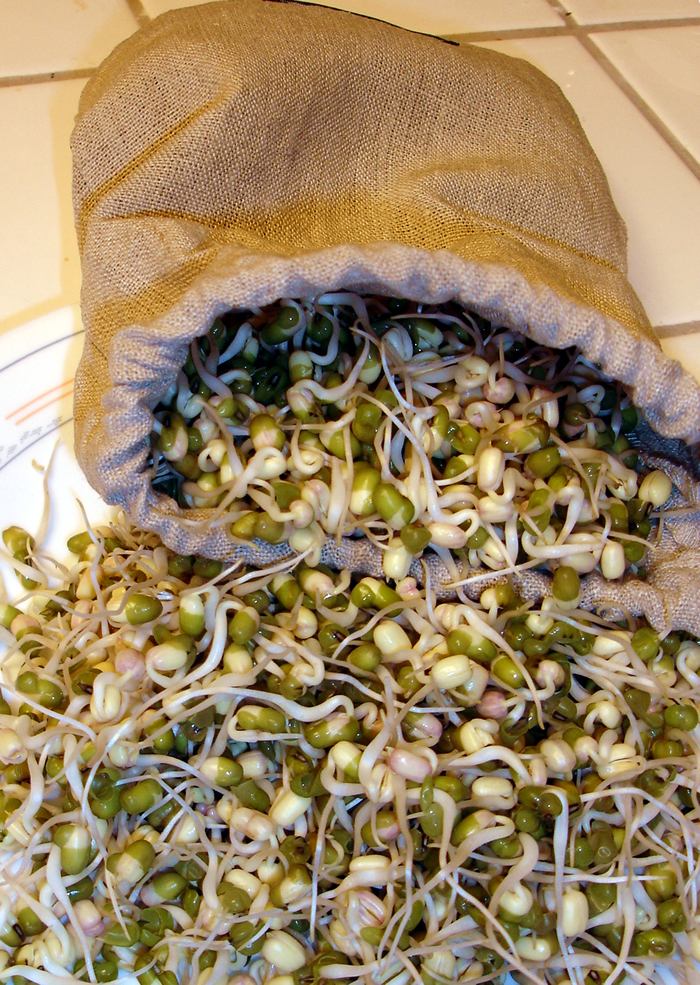 SproutingAfter attending a lecture by "Sproutman" Steve Meyerowitz I used the hemp bag I had purchased to make my first sprouts from mung beans. The lecture explained how sprouting is a means of quickly growing organic produce indoors, year-round, that is more nutritionally dense than traditional vegetables. More info on "sprout bags" and a YouTube of Steve here: http://sproutman.com/sprouters/sproutmans-natural-hemp-sprout-bag